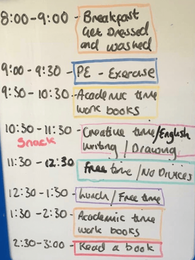 One of my lovely friends sent me this timetable that she was doing with her little girl before the Easter holidays and although we didn’t massively stick to it, having a rough structure to our day has helped us all understand who’s doing what and when. Work time, fun time, creative time, tech time, mummy time, do whatever you want time (but please don’t kill each other time!).
